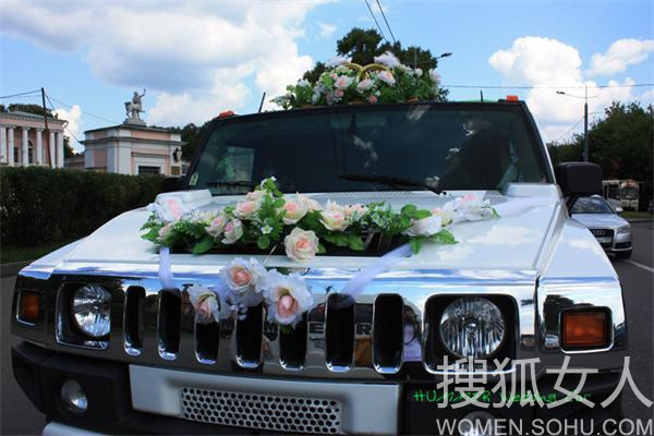 俄羅斯人對婚車非常講究,即使自己有車,也要去租車公司租加長版的豪華轎車。租車市場生意很火爆,訂車最好能提前兩個月。以下是一家租車公司的報價:凱迪拉克,23座,起價4800盧布一小時;克萊斯勒,10座,起價4000盧布一小時;悍馬,20座,起價5500盧布一小時; 林肯,11座,起價3300盧布一小時; 保時捷,11座,起價6500盧布一小時。車上的裝飾價錢另算,假花大概要2000盧布,真花要2000-5000盧布。也有年輕人覺得這些豪華轎車太俗,選擇比較標新立異的婚車,比如老爺車、馬車,甚至壓路機,想在大海上辦一場浪漫婚禮的新人得租遊艇。娜塔莉婭說,她曾經見過一對新人的婚車車隊是17 輛橙色的MINI-cooper, 還有一對新人的車隊是20輛蘇聯時期產的「海鷗」和「伏爾加」汽車(行情 專區)。