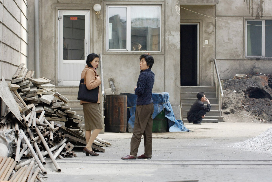 朝鮮平壤,兩位在路口交談的婦女。