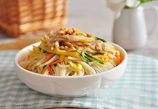 8、和麵條,蛋絲拌在一起,吃的時候撒花生碎即可。