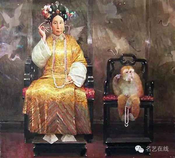 慈禧太后挖耳圖,一隻學人的猴子坐在旁邊,嘲諷意味頓生。