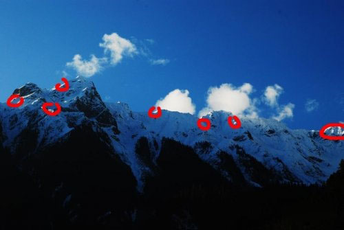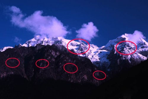 4、光:光對山的構圖來說是至關重要的,上圖的山脈有陽光照射,有陰有陽,立體感強。下圖的光線幾乎是逆光的,紅圈處的光亮意味著陽光在不久將會增加照射範圍,所以此時拍攝的時機欠佳。