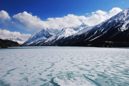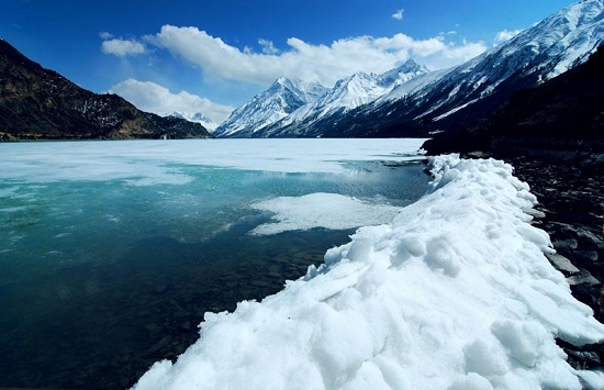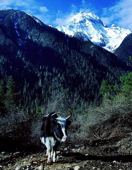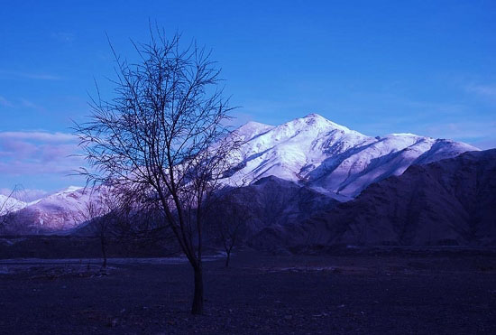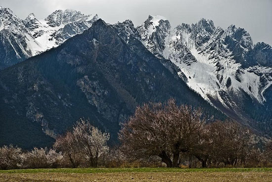 1、畫面的點綴:雪山下的桃花在這幅畫面中,是一個關鍵點,沒有桃花的參照與點綴,雪山將視之無味。桃花在畫面中,首先是處在畫面的下三分之一處,色彩與雪山呈較大反差,增加了畫面的色彩感。同時桃花是柔,雪山是鋼,柔鋼相應,更加意味深長。