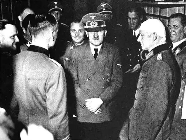 不過此時希特勒心裡還裝著別的事情:他要準備去迎接墨索里尼。義大利領袖將在3點鐘到達這裡。他叫男僕取來一套新制服換上后,便在衛兵的重重保衛下,乘車前往附近的火車站。天空烏雲密布,稀稀拉拉的幾個雨點,解除不了下午的悶熱。他把帽沿拉得低低的,耳朵里塞著棉花球,還披著一件黑色的長斗篷,隱蔽著他那吊在懸帶上的右臂。火車晚點了一小時,當專列抵達車站時,已經是下午4點了。
