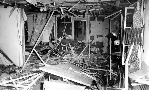 豪辛格的黯淡彙報快講完了,希特勒遠遠地探出身子看地圖,正看得入神。豪辛格正在結束他關於當天的不利形勢的彙報:「俄國人正以強大的兵力在杜那河西面向北推進。他們的前鋒已到杜那堡西南。如果我們在貝帕斯湖周圍的集團軍不立即撤退,一場災禍……」這句話永遠不能說完了,就在豪辛格講到「災難」一詞的時候——中午12點42分,炸彈爆炸了。