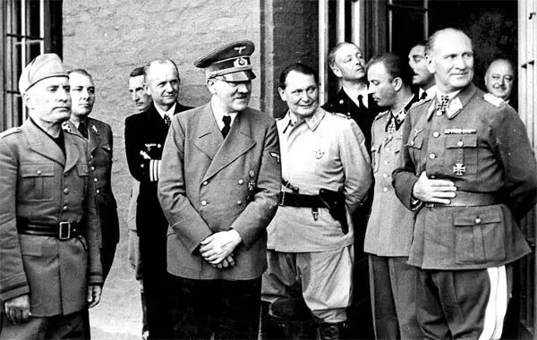 當義大利領袖前來向德國元首尋求小恩小惠時,戈林(右三)和鄧尼茨(左三)也趕到「狼穴」代表海軍向希特勒宣誓效忠。