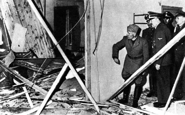 兩人默默地視察著被炸毀的會議室。環顧四周,只見房頂倒塌,牆皮剝落,窗框被炸飛,破椅散亂,桌子被炸成兩半,地板上有一個直徑半米的彈坑。墨索里尼被嚇得魂不附體,他無法理解最高統帥部里怎能發生這種事情。希特勒的反應截然相反,他開始把每個細節原原本本地作了解釋:「我當時正站在這張桌子旁邊,……」邊說邊向墨索里尼表示他怎樣彎下腰去看攤在桌上的地圖,又怎樣用右手支住身子,就在此刻,炸彈幾乎就在他手臂底下爆炸了,他右手就此受了點傷。希特勒還給墨索里尼看燒壞了的上衣和撕破的褲子,並讓墨索里尼看他後腦勺燒焦的頭髮。