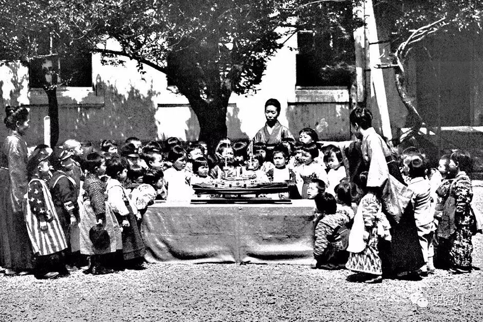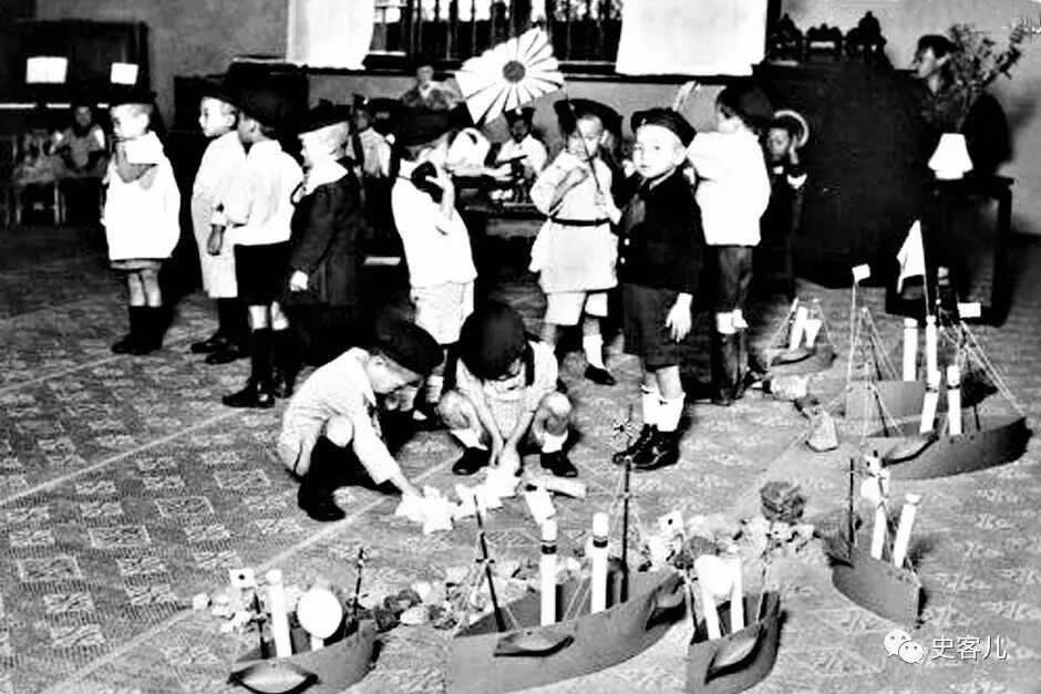 ▲ 圖為1923年,日本一所幼兒園的學生正在製作船模。