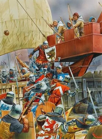 時鐘撥回兩天前,在布隆奎塔格渡口,一部分法國河岸守軍被打散后慌不擇路逃到了西北方的努瓦耶爾鎮。英軍休斯.德斯潘塞爵士的騎乘分隊很快追蹤而至,將小鎮付之一炬。接下來兩天里,爵士的分隊馬不停蹄地穿過拉布羅耶、Rue和勒克羅圖瓦,在索姆河入海口留下了一個漂亮的U型運動軌跡。他們沿途搜索海平線內己方艦隊蹤跡,絞殺逃散的法軍殘兵,順帶燒殺搶掠。照慣例,「繳獲物」的2/3會歸弓箭手們本人所有,剩餘1/3才需上交分隊指揮官、總指揮和國王,比起虛無縹緲的上帝和民族,這些實惠更能刺激底層官兵奮勇戰鬥、滿載而歸。
