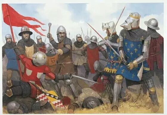 面對嚴陣以待的英軍,查理明智地命令重騎兵捨棄戰馬,在熱那亞弩手的支援下,以密集陣型推進。敵軍進入射程(200碼左右)后,英軍弓箭手立即開始從兩翼射出密集的箭矢,很快壓制了熱那亞弩手的反擊。英軍重騎兵隨後也擊退了被箭矢打亂陣型的法國重騎兵。