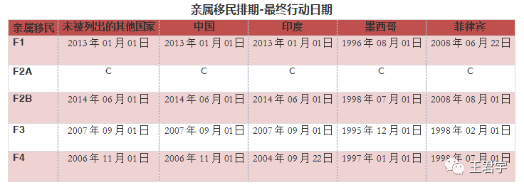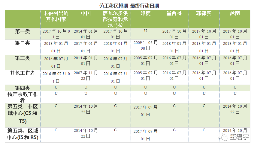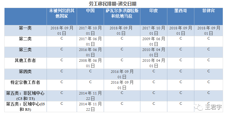另外,最終行動日期代表(Application Final Action Dates):指有簽證名額的排期。遞件排期(Datesfor Filing):指可以遞交簽證申請的排期。在下列表格中,每一類所列出的日期都已經是超額申請的,C 意味著現在,比如對所有有資格的申請人,授權發放的數量。U意味著沒有授權,比如還未授權發布的數量。
