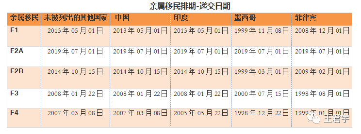 下文的移民排期表是2019年09月最新的移民申請時間。其中, 中國—優先雇傭(E1)和第三優先順序(E3):儘管中國E1最後行動日期早些時候倒退了,移民局要求調整優先權日期早於該日期。但是,依然有很多人申請人等待轉換身份。因此,有必要再次倒退中國E1最後的行動日期。USCIS對中國E3的需要急劇增加致使該日期的倒退,從而使得未來的申請人數在年度限制下。E1和E3的倒退都將在9月立即實行。