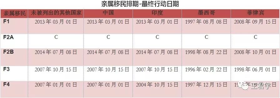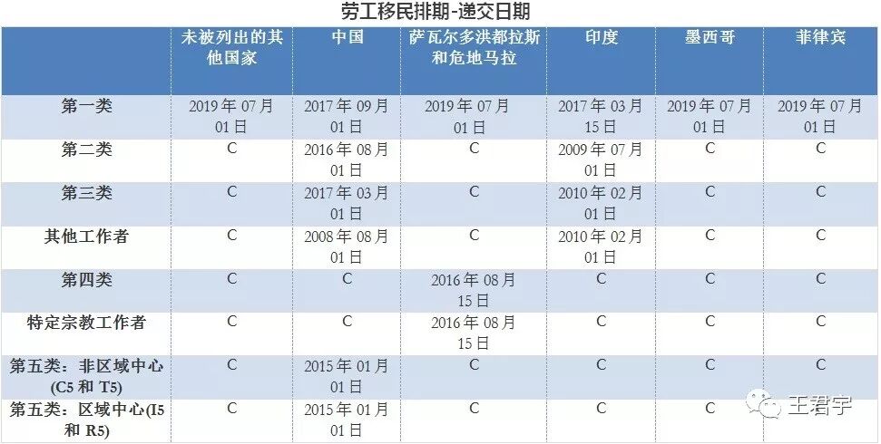 另外,最終行動日期代表(Application Final Action Dates):指有簽證名額的排期。遞件排期(Dates for Filing):指可以遞交簽證申請的排期。在下列表格中,每一類所列出的日期都已經是超額申請的,C 意味著現在,比如對所有有資格的申請人,授權發放的數量。U意味著沒有授權,比如還未授權發布的數量。