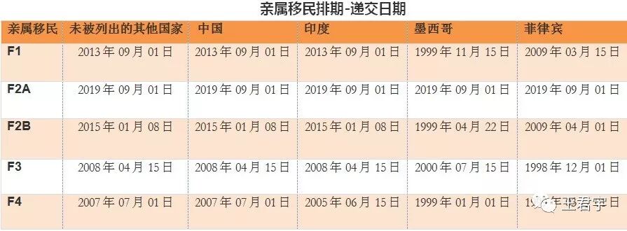 F1類別為美國公民未婚子女以及美國綠卡的配偶和子女,以及綠卡的未婚子女 F2A類別為美國綠卡的配偶和子女 F2B類別為美國綠卡的21歲以上未婚子女 F3類別為美國公民的已婚子女 F4類別為美國公民的兄弟姐妹