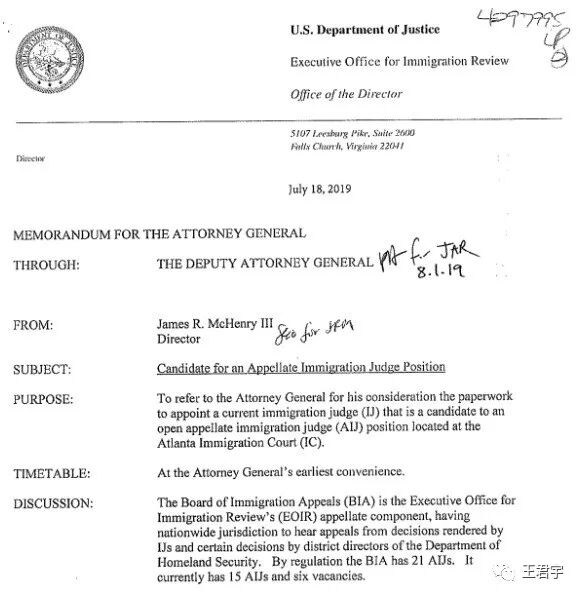 移民審查執行辦公室主任詹姆斯·麥克亨利(James McHenry) 司法部已改變了招聘程序,將永久性地招聘被指控偏見的移民法官安置在強大的移民上訴委員會(BIA)上。根據獲得的備忘錄上顯示,BIA在八月份增加的所有六名董事會成員都是庇護拒絕率最高的移民法官。在同一上訴機構發給他們進行重新審議的2017年,一些裁決的數量也最多。所有六名成員均被立即任命為董事會成員,無須長達一年的試用期。這加劇了人們對移民法院系統政治化的擔憂。 備忘錄