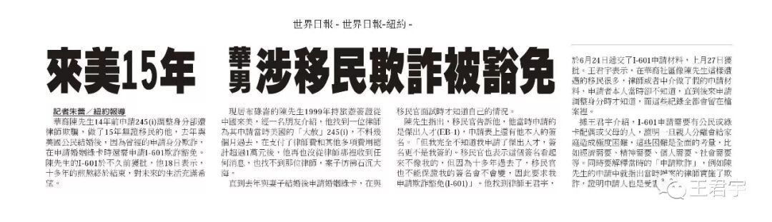 申請I-601欺詐豁免需要很多強而有力的證據和辯理才有機會說服移民局原諒你。一旦發現你說謊了,你必須立刻找專業的律師諮詢。王律師指出,申請不能亂填,否則後患無窮。另外,一開始找對律師非常重要,找錯了不但移民申請會被拒絕,今後的申請也會面臨拒絕的可能,因為,移民局會有你所遞交所有申請的完整記錄。律師可以在詳細了解你的情況后,再判斷你是否可以做I-601豁免,或其它類型的豁免。 王君宇律師樓微信號 ☞w7183539264專精各種疑難案件:移民,刑事,告警察/政府。我們有最優質的服務,最專業的律師和助理團隊。王君宇律師服務華人社區十幾年,幫助無數客人打消遞解令獲得身份。為無數客人在刑事辯護中獲得最好的結果。王律師一直走在法律的最前線,王律師總是能洞悉新的法律信息從而給予客人最好的幫助。