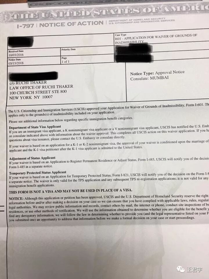 I-601是欺詐豁免的申請,一般都是由於之前向美國政府遞交的材料中有作假、欺騙信息,或者之前的律師沒有做好需要通過I-601豁免才能解釋。有相當一部分申請人在申請B1/B2簽證時,不真實或不完全地填寫自己的情況。譬如,未婚的或者離婚的說成已婚;不實的工作單位/收入填報;不填寫已在美國的父母、配偶、子女、兄弟姐妹或未婚夫(妻);不實填寫或拒答以前在美國逾期居留的事實;不如實填寫犯罪或被警察逮捕過的等事實。以上這些行為都會被移民局認為是簽證欺詐或誤導。 I-601批准通知 I-601豁免只豁欺詐,而不豁免其他原因。他也不可以豁免所有欺詐問題。他只豁免INA section 212(a),這些包括與健康有關的拒絕理由,某些刑事理由,移民欺詐和虛假陳述,極權黨的成員,走私者,受到民事處罰,由於以前在美國非法居留,因此存在3年或10年的限制。他無法豁免如庇護欺詐,婚姻欺詐多次入境等問題。 簽證欺詐 欺詐豁免是向美國移民局遞交的,美國移民局可能需要6到8個月來審核。I-601對於有公民或綠卡的配偶或父母的人需要證明極度困難,公民孩子不符合做I-601豁免。這些困難是個全面的考量。不僅僅是醫療問題,它是個全面性的考量,比如社會上的需要,家裡的需要,經濟上的需要,精神上的需要,基本上就是一個人對另外一個人的各個需要。 成功案例