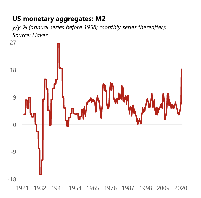 在美聯儲上周公布的貨幣存量數據中,M2較上年同期增長18.5%,這是1981年以來的最高增速。到今年年底,美國的M2的年增長率很可能會攀升到20%到40%之間。