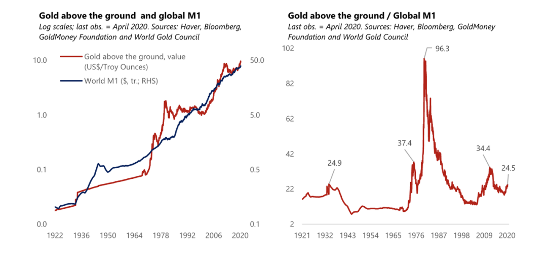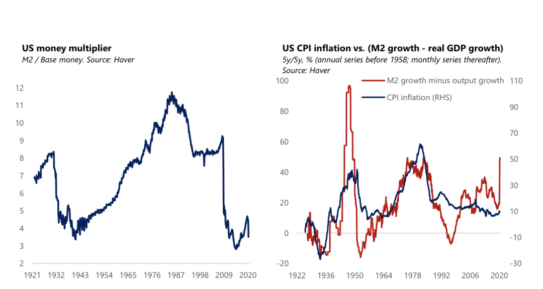 儘管在短期內,通脹與M2增長(超過實際產出增長)之間的關係並不穩定,但在較長期內二者關係保持穩定。歷史上,在5年的時間跨度內,M2增速與實際產出增速背離的情況只出現過兩次:上世紀70-80年代和40年代末的通脹時期。