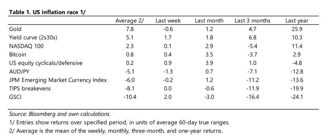 考慮到我們的目標是在大通脹時期投資價格攀升最快的資產,以下這張表反映了上述資產在短期、中期和長期的平均表現,資產的最終回報經過波動率調整。