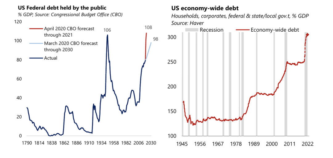 在新冠疫情全球大流行之前,全球債務已經處於非常高的水平。貨幣擴張正在為更大規模債務提供資金,這暫時沒有引發債券市場收益率的反應。