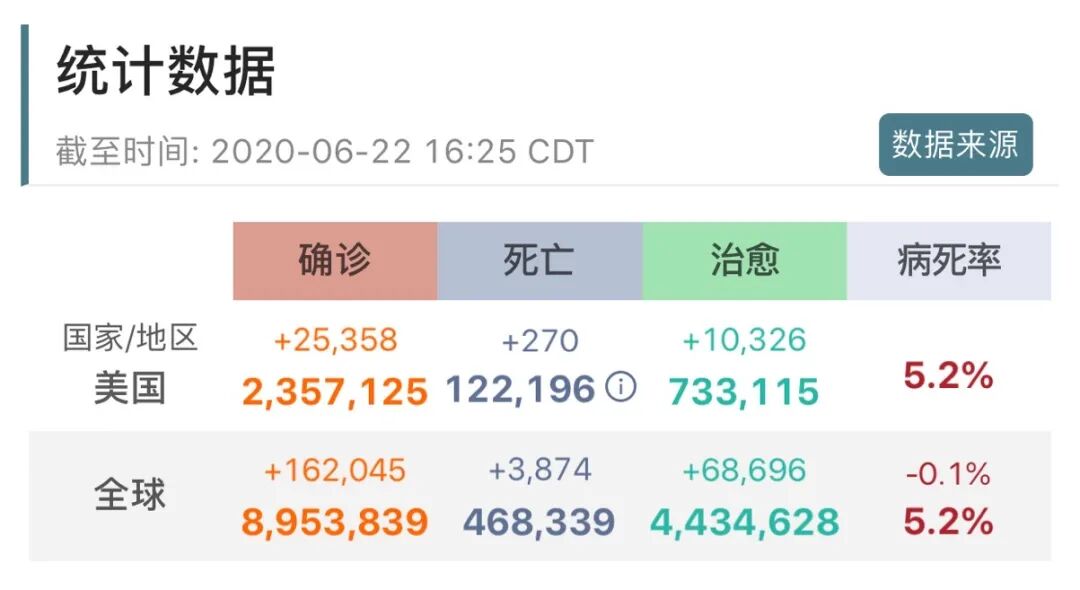 6月22日,截止發稿為止全美新冠確診已經近236萬,死亡人數新增270人,總死亡人數達到122,196人。