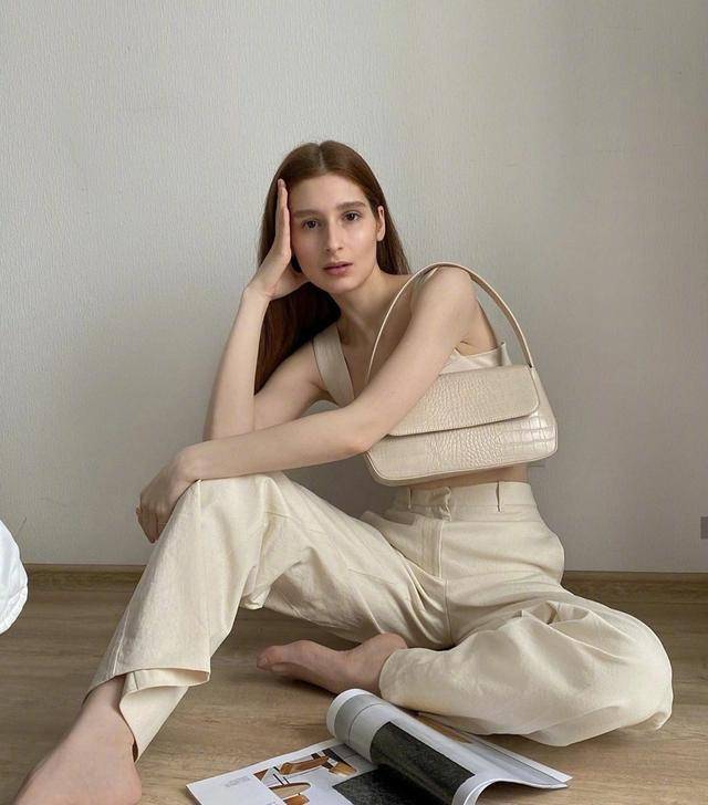 許多小可愛並不是很喜歡純白的套裝,這樣的造型大街上一抓一大把,我們就可以穿相近的顏色。Lespgdn的這一套米白色的套裝款式,就極具大膽和優雅,拎上一個同色的腋下包分分鐘走出都市麗人的風範。