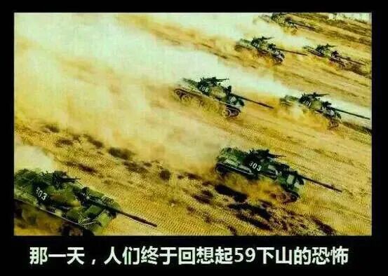 59式坦克作為相當長時間共和國的主力裝甲力量,經歷了各種大大小小的魔改,59已經逐漸成為了一種文化,一種象徵。在這種環境下,「對面的59下山了」這個梗其實是來自遊戲《坦克世界》。