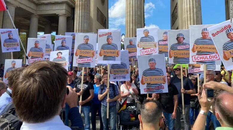 柏林,抗議者舉著印有國會議員照片的牌子,標語:「有罪」