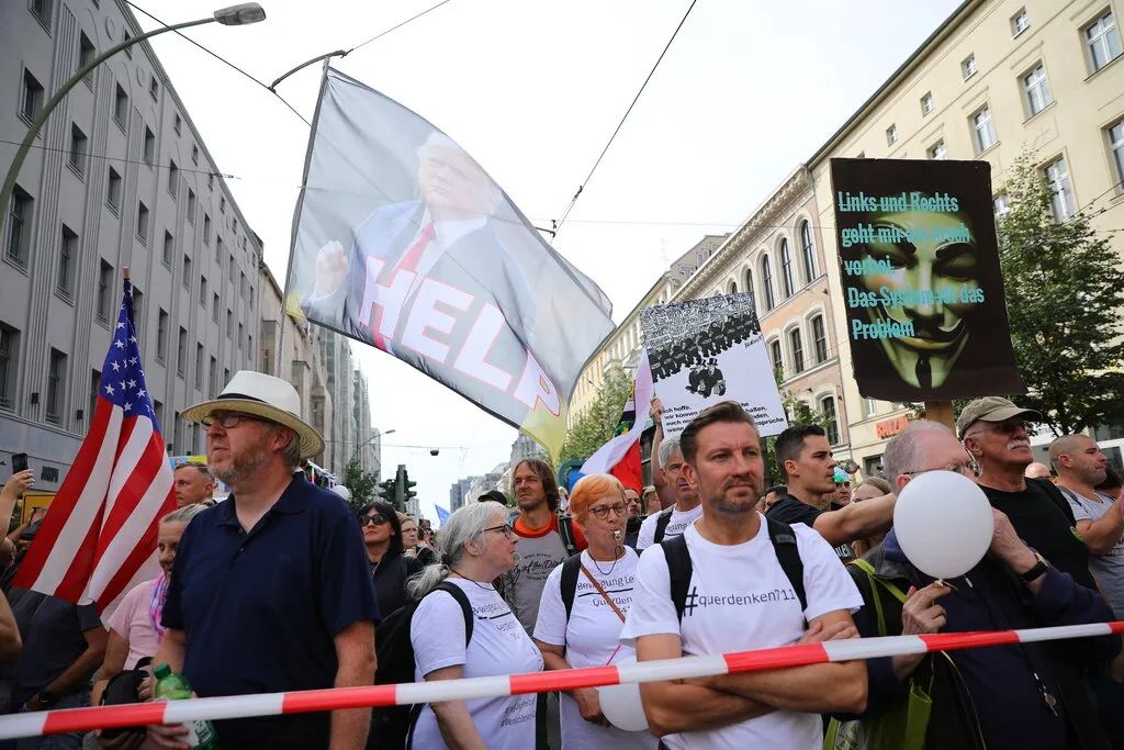 據bbc報道,這次參與柏林抗議的人群多是「右翼極端分子」,人群中可以看到支持極右派的旗幟和T恤。