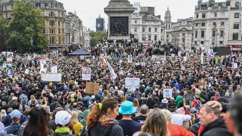 在倫敦,數千人聚集在特拉法加廣場,抗議包括冠狀病毒限制和5G在內的問題。