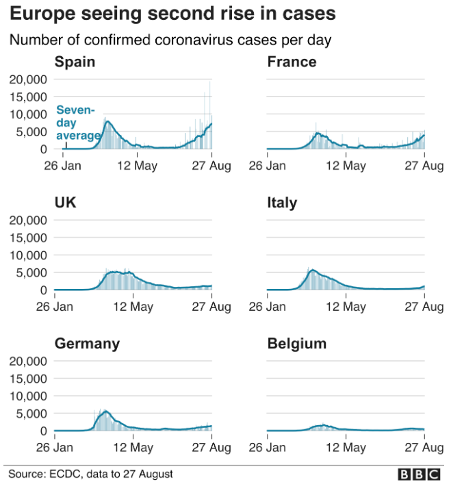 這幾個國家近日來疫情都出現了上升,其中西班牙和法國最為明顯。