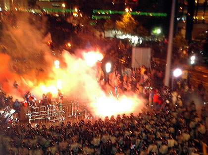 下午4時許,有示威者衝出示威區,警員再度出動胡椒噴霧,有警員因站在高處居高臨下控制場面,最後成為被攻擊的目標。整條馬路如同戰場一般,警方多次施放胡椒噴霧,但都未能控制場面,部分防暴盾牌也被示威者搶走,成為韓國示威者的攻擊武器,示威者還向警員投擲雜物。雙方糾纏20多分鐘后,消防員於下午4時40分首次用高壓水槍向示威者噴水,但仍無法阻擋示威者。   示威者企圖推翻警車