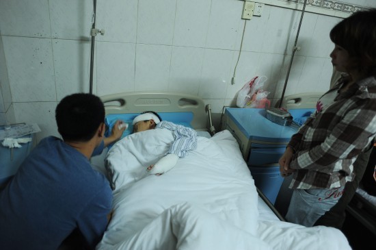 4月28日晚,受傷的學生在雷州市人民醫院接受治療,其家長陪在身邊。