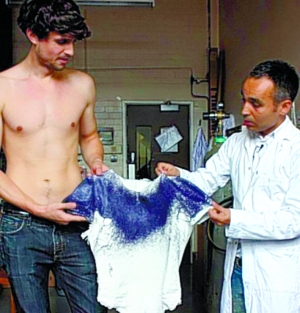 托雷斯拿著脫下的T恤衫展示,這件衣服可以清洗,然後重新穿上。