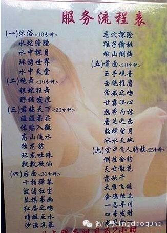除此之外,東莞的「小姐」根據服務地域的不同,被分為「酒店小姐」、「俱樂部小姐」、「洗浴小姐」和「髮廊小姐」四類,收費標準從幾十元到幾萬元不等。嫖客們在這裡可以較低的消費享受到「皇帝式」的30多項服務。所以,無論來的客人是老闆還是一般職員,即便是來此打工的外地農民工,都能找到相應的「小姐」。這一產業鏈因此產生了巨大的經濟效益。