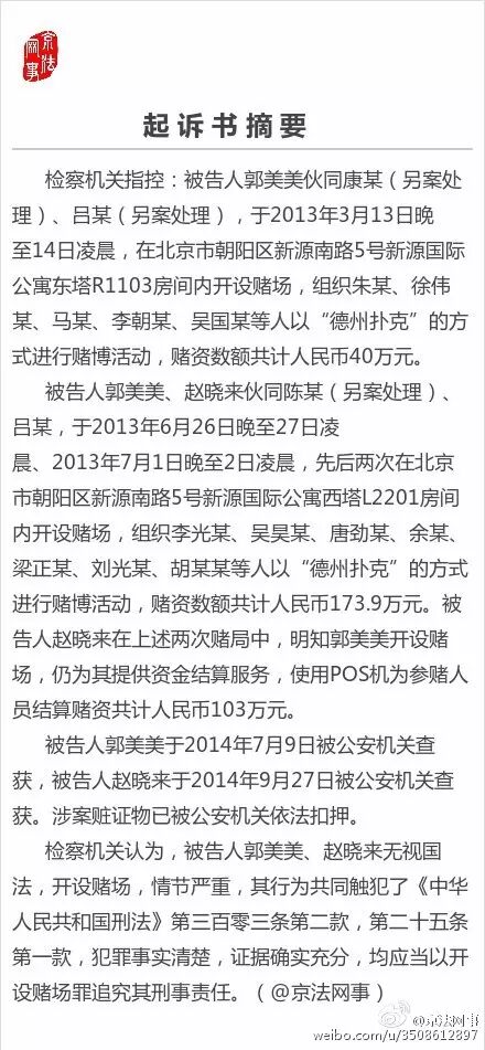 檢方指控的兩樁犯罪事實中,第一次是郭美美夥同其外籍男友康奈德、助理呂某開設賭場,第二次是郭美美、趙曉來夥同陳某、呂某開設賭場。
