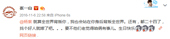 楊紫生命中另一個重要的男人就是她從小懟到大的「弟弟」張一山。在楊紫生日時,張一山第一時間發來視頻祝福,並放出「就算全世界背叛你,我也會站在你身後背叛全世界」的霸道總裁范兒豪言。