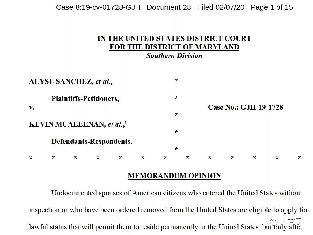 自2018年起,許多通過公民申請身份的人去移民局(USCIS)辦公室面談時被移民海關執法局(ICE)逮捕因為他們有遞解令在身。最近馬里蘭州的一位聯邦法官判決禁止移民官員逮捕,拘留和驅逐以與美國公民結婚為基礎尋求合法身份的移民。 婚姻綠卡 美國馬里蘭州地方法官Judge George J. Hazel在Sanchez, et al. v. McAleenan, et al. 案件中發布了一項全班範圍的初步禁令,禁止ICE逮捕,拘留或遣返有遞解令並在I-130婚姻訪問中與美國公民結婚的非公民。法院還下令ICE將所有非公民申請人和提議的集體成員從羈押中釋放,包括釋放監督令和移民拘留令。Sanchez, et al. v. McAleenan, et al.案件 許多有遞解令的人可以通過公民配偶申請豁免來消除遞解令而第一步是需要證明申請人和配偶婚姻的真實性。但因為ICE在故意問話時設置陷阱來抓申請人導致很多人不敢申請。法官表示,申請有權去問話來獲得身份。雖然該裁決是在馬里蘭州的法院,但這對於所有州都有有效。目前尚不清楚在該裁決下會釋放多少人。 移民局牢 如果您或您的親朋好友在問話時已被ICE扣留,應立即找律師看看是否有方法幫您保釋出來。在移民牢的每分每秒都有可能被遞解。所以聘請一個有經驗的專業移民律師。如果您或您的親友在美國沒有合法身份,就不用擔心去問話會被抓。所以如果您還沒有身份應該立即找資深律師尋求解決方案看看是否可以申請。 王君宇律師樓微信號 ☞w7183539264專精各種疑難案件:移民,刑事,告警察/政府。我們有最優質的服務,最專業的律師和助理團隊。王君宇律師服務華人社區十幾年,幫助無數客人打消遞解令獲得身份。為無數客人在刑事辯護中獲得最好的結果。王律師一直走在法律的最前線,王律師總是能洞悉新的法律信息從而給予客人最好的幫助。