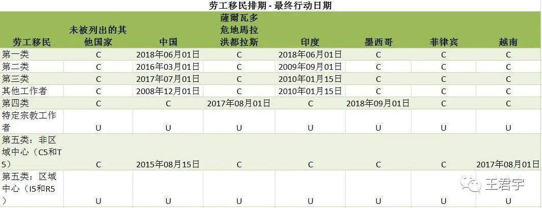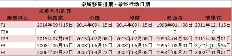 下文的移民排期表是國務院(DOS)發布的2020年10月最新的移民申請時間。其中,最終行動日期代表(Application Final Action Dates):指有簽證名額的排期。遞件排期(Dates for Filing):指可以遞交簽證申請的排期。在下列表格中,每一類所列出的日期都已經是超額申請的,C 意味著現在,比如對所有有資格的申請人,授權發放的數量。U意味著沒有授權,比如還未授權發布的數量。 F1類別為美國公民未婚子女以及美國綠卡的配偶和子女,以及綠卡的未婚子女