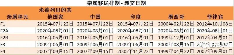 F2A類別為美國綠卡的配偶和子女 F2B類別為美國綠卡的21歲以上未婚子女 F3類別為美國公民的已婚子女 F4類別為美國公民的兄弟姐妹 第1類別EB1為傑出人才 第2類別EB2為優秀人才,獲國家利益豁免(NIW)而無需僱主
